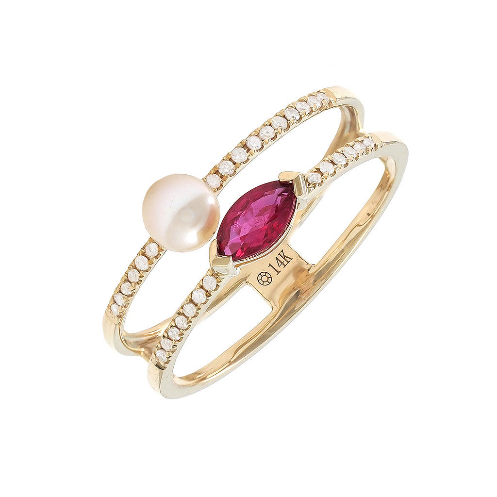 Anillo en oro amarillo 14k con .09ct de diamantes y .34ct de rubi.
