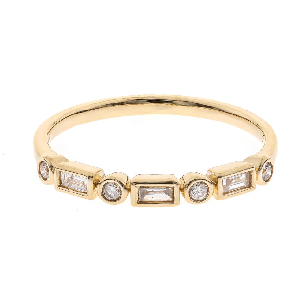 Anillo en oro amarillo 14k con .12ct de diamantes en corte baguette y .07ct de diamantes en corte redondo. Talla #7