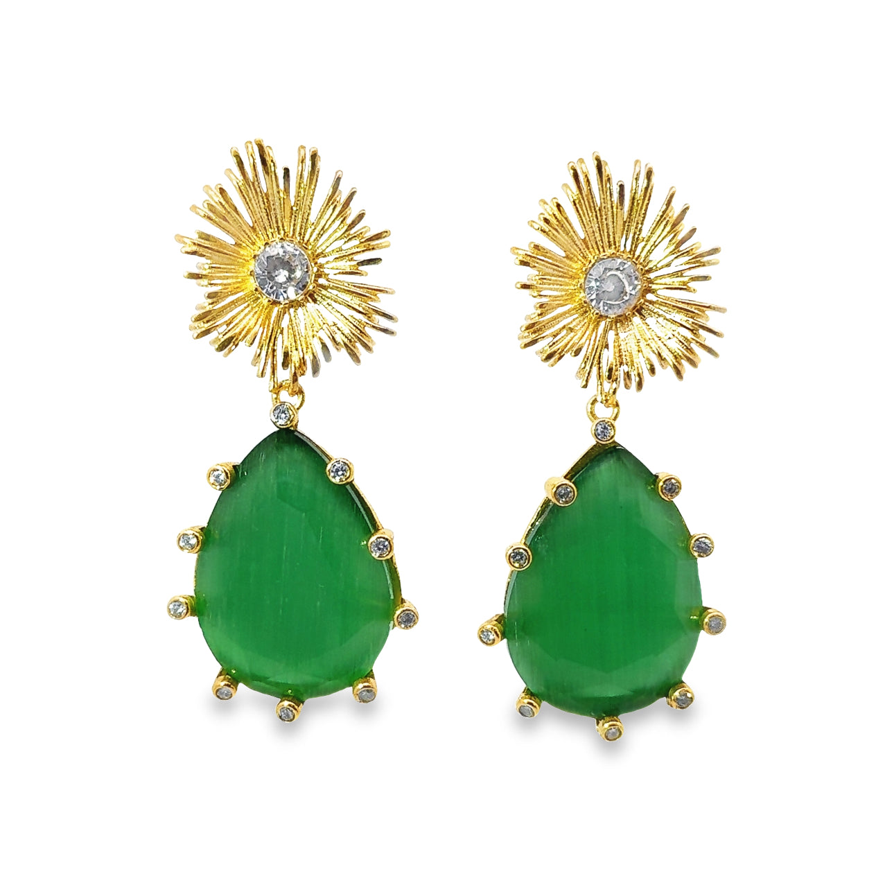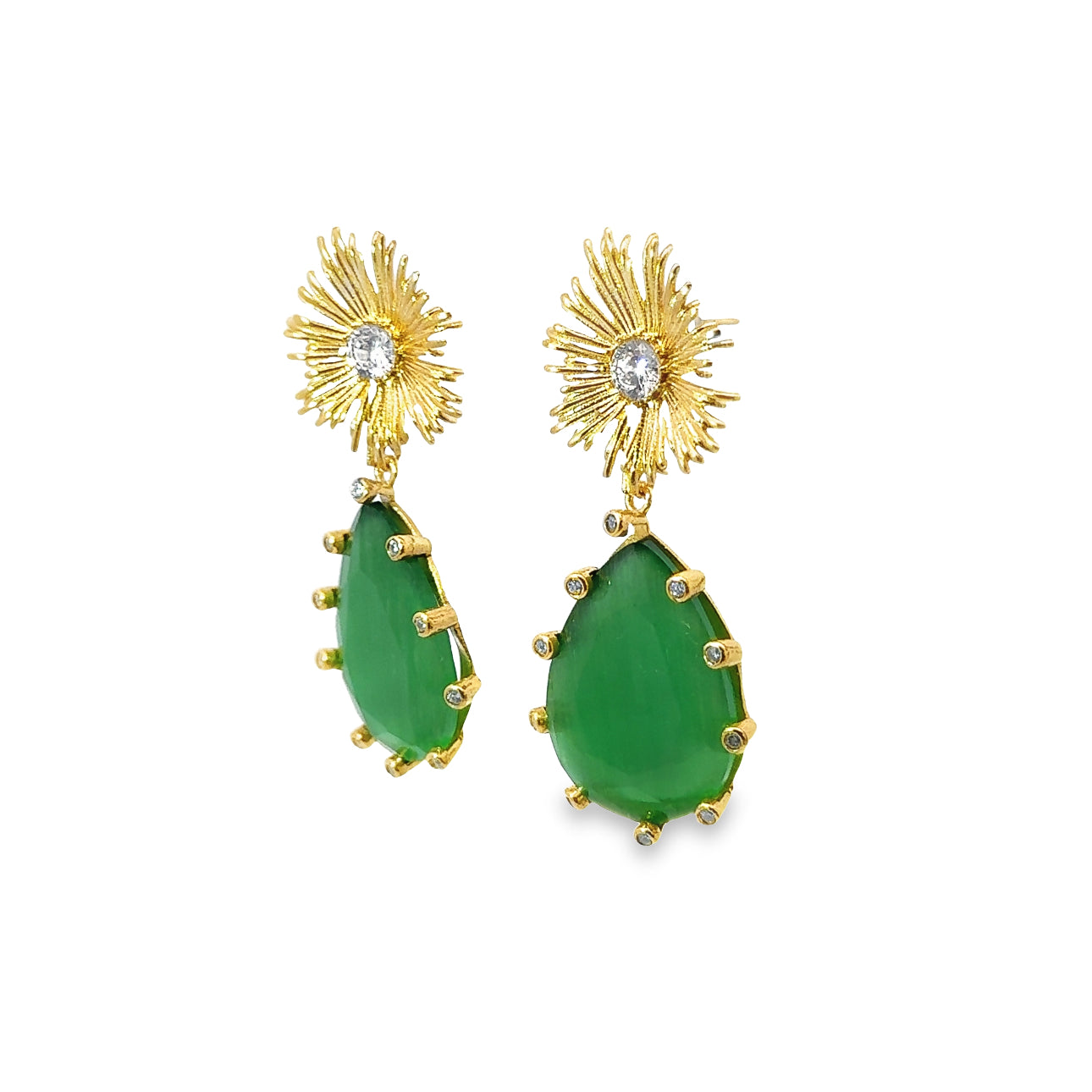 Aretes largos en chapa de oro con zirconia y piedras naturales.