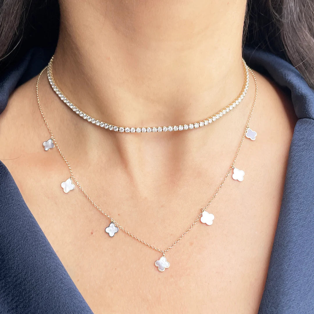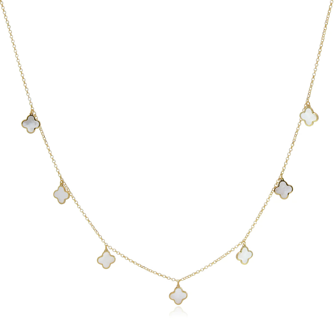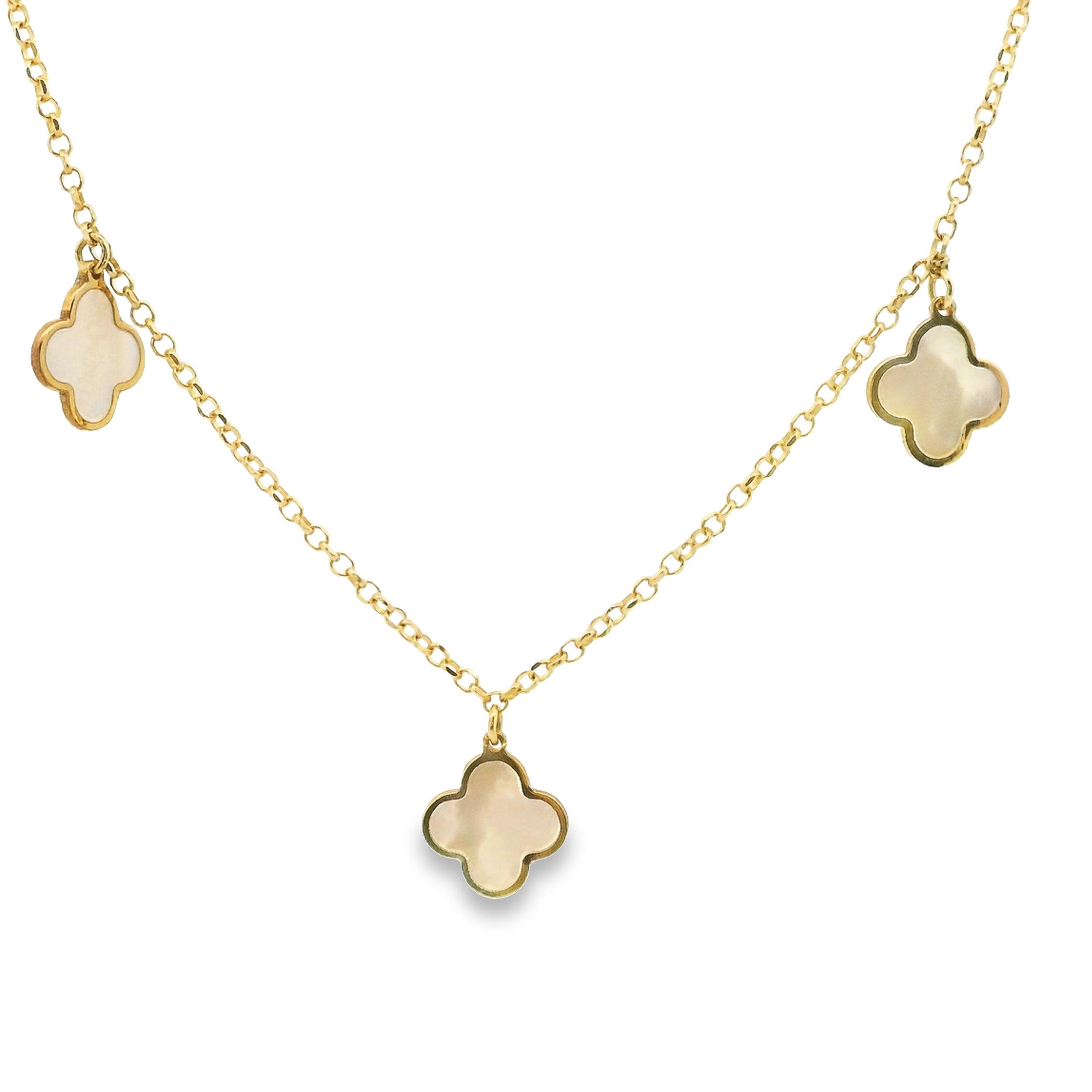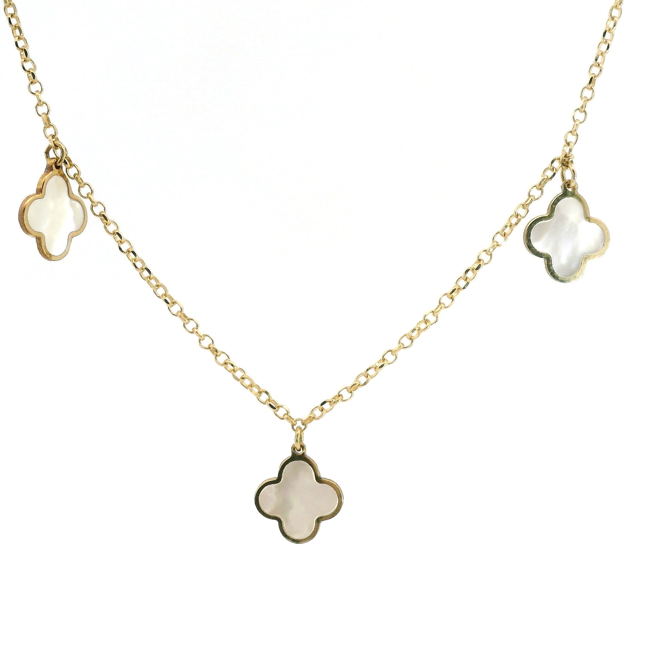 Collar en oro amarillo 14k con mini clovers colgantes en madre perla.