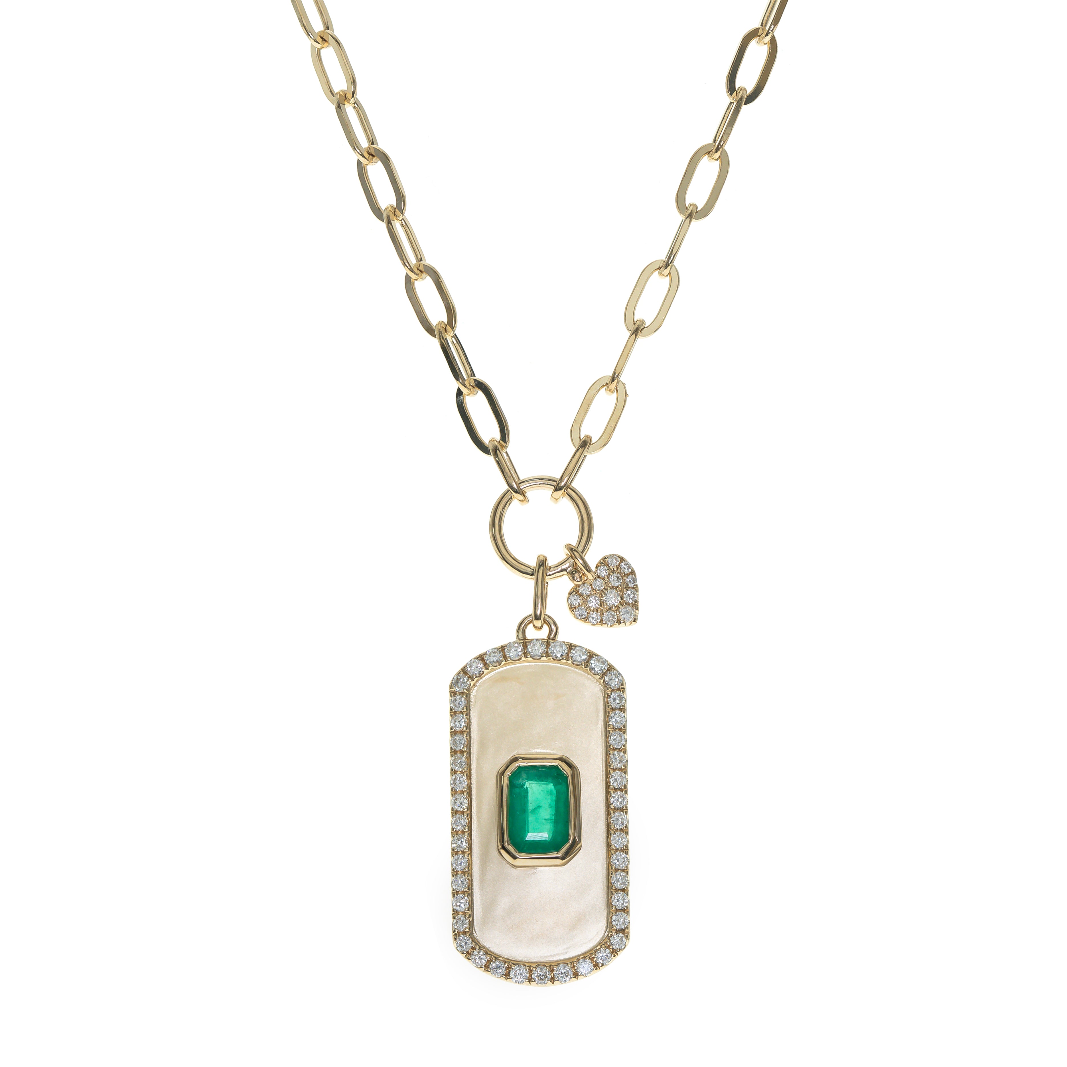 Cadena paperclip con charm en oro amarillo 14k con .60ct de esmeralda y .36ct de diamantes.