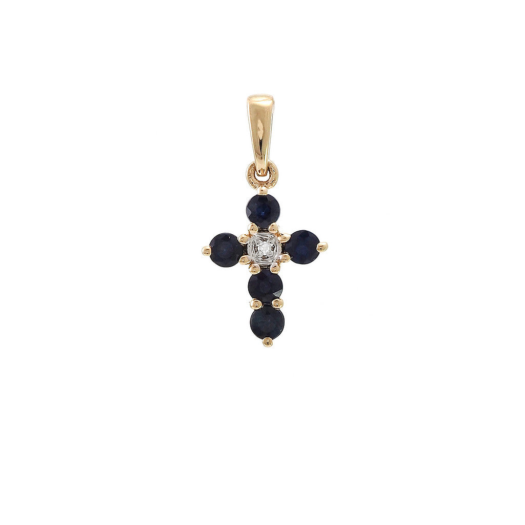 Cruz mini con cadena en oro amarillo 14k con .01ct de diamantes y .31ct de zafiro.