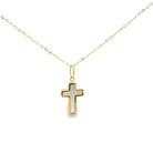 Cruz de madre perla mini con cadena en oro amarillo 14k.