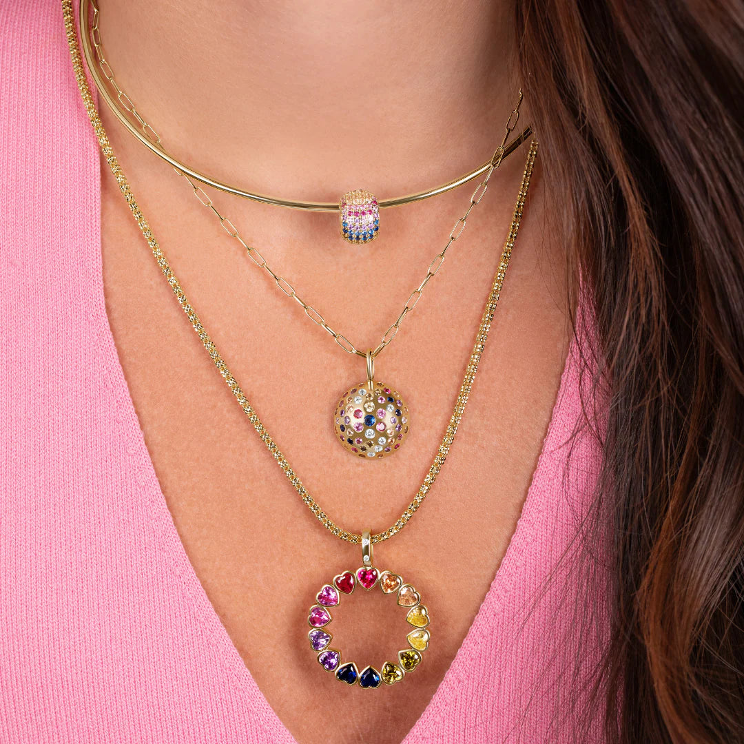 Hard choker en plata con baño de oro y spacer de zirconias de colores.