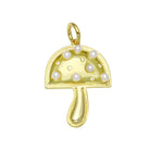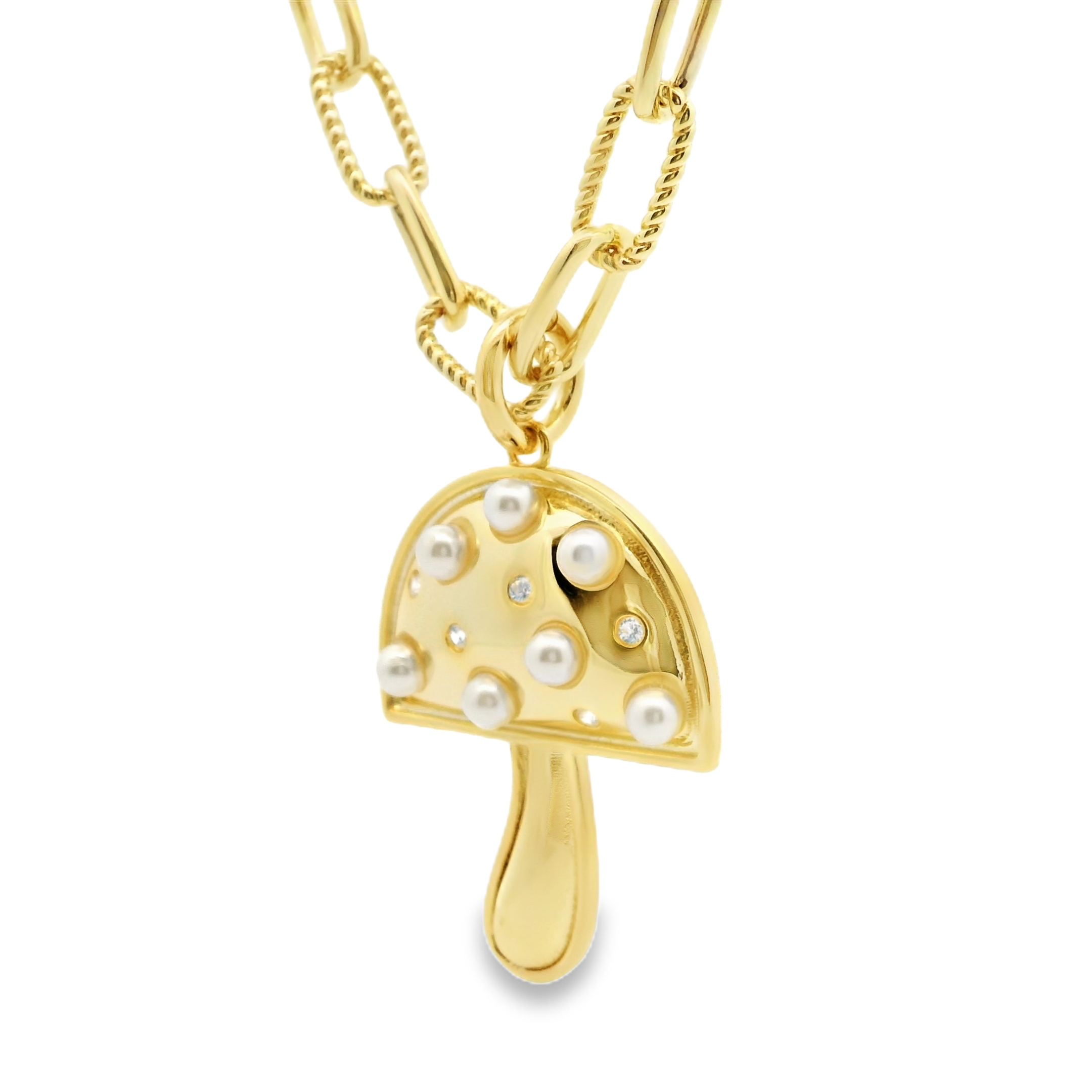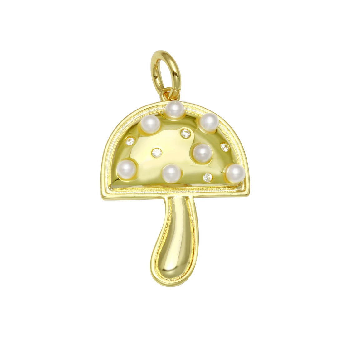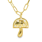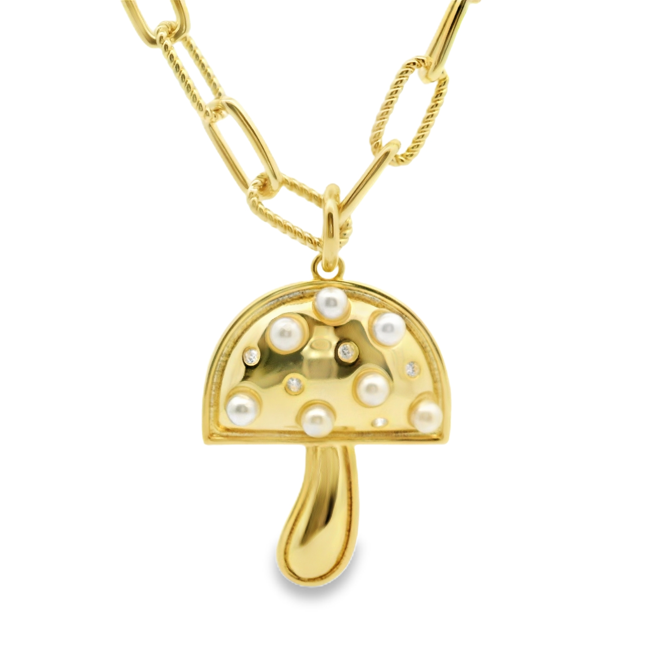 Cadena de plata con baño de oro y charm de hongo con zirconia y perla.