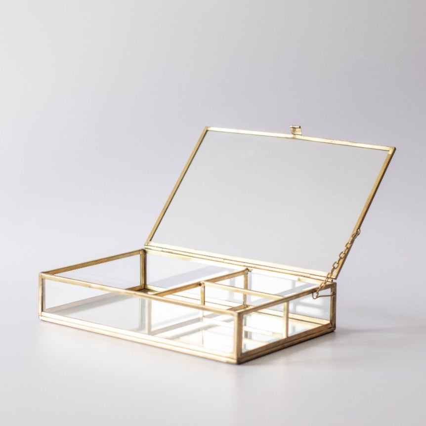 Joyero rectangular en vidrio transparente con marco de metal y base de espejo. Tapa con pequeño gancho en la parte frontal y cadena de metal en un lado. Tres compartimentos. Base acolchada. Medidas 5,5x16x25 cm.