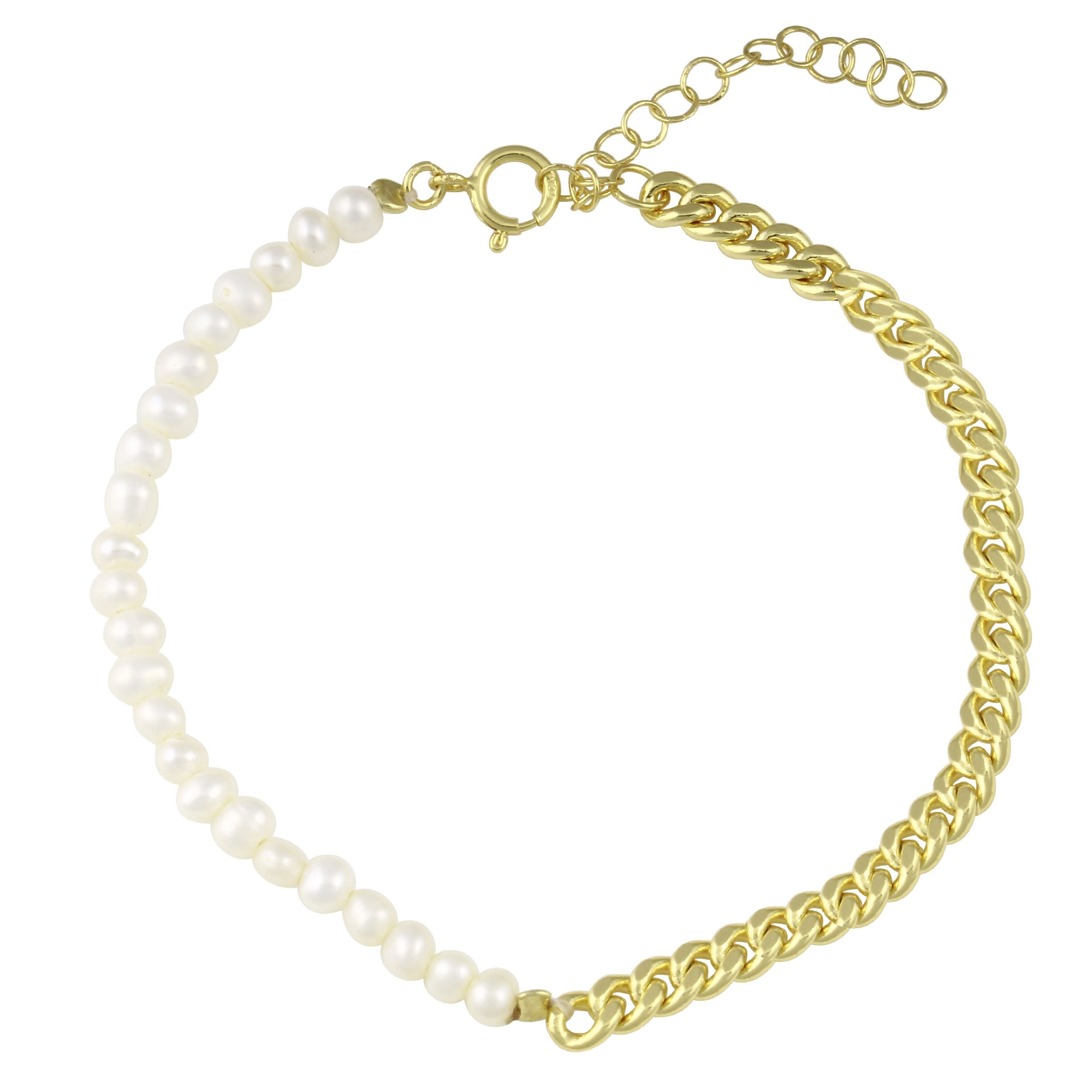 Pulsera half cuban chain half perla en plata con baño de oro.