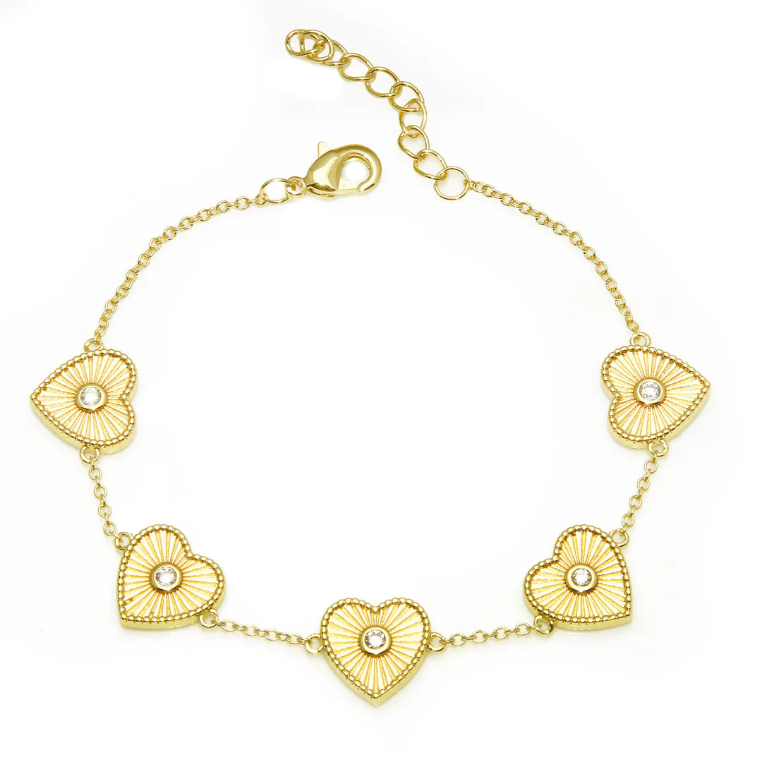 Pulsera de corazones en plata con baño de oro y zirconia.
