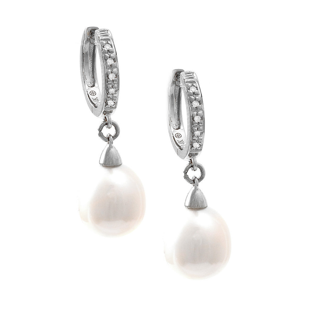 Huggies en oro blanco 14k con perla natural y .03ct de diamantes.