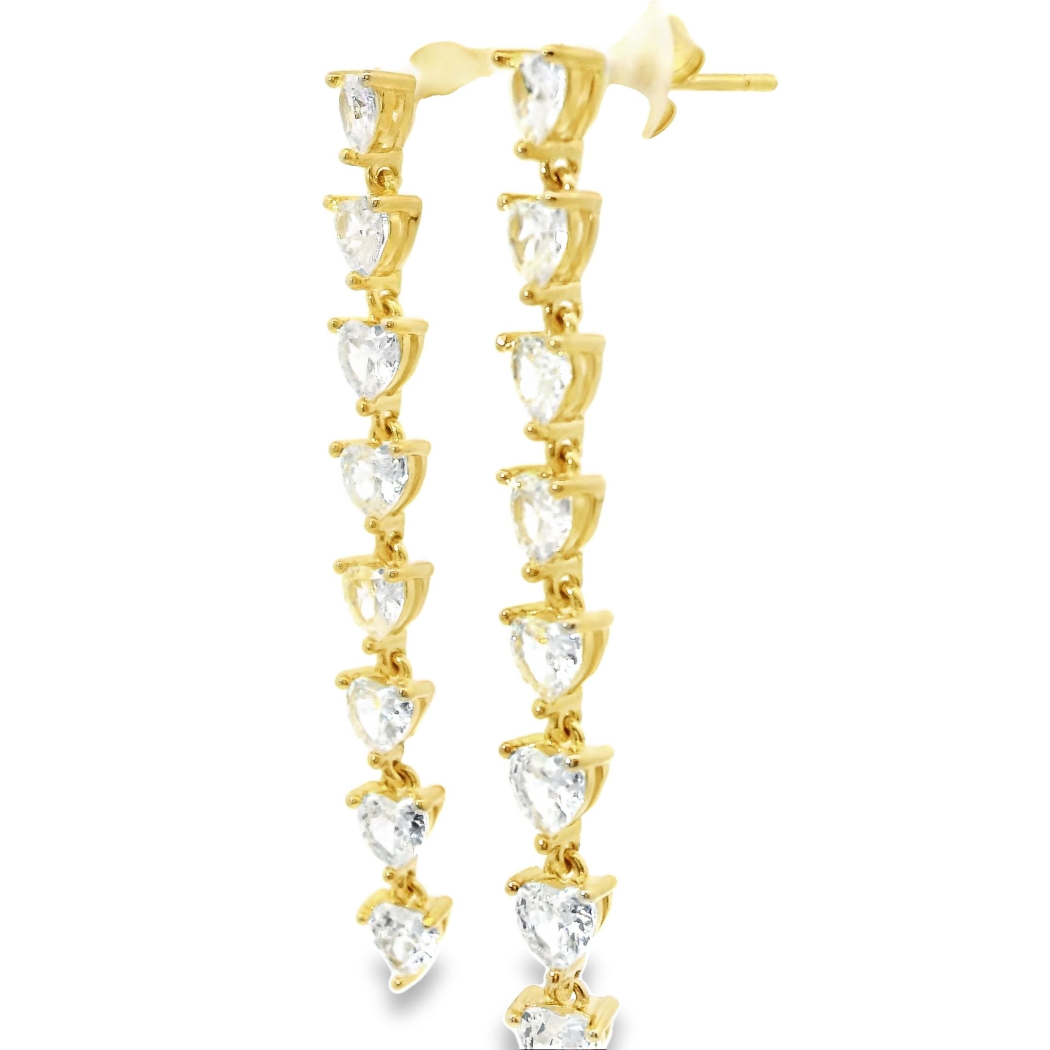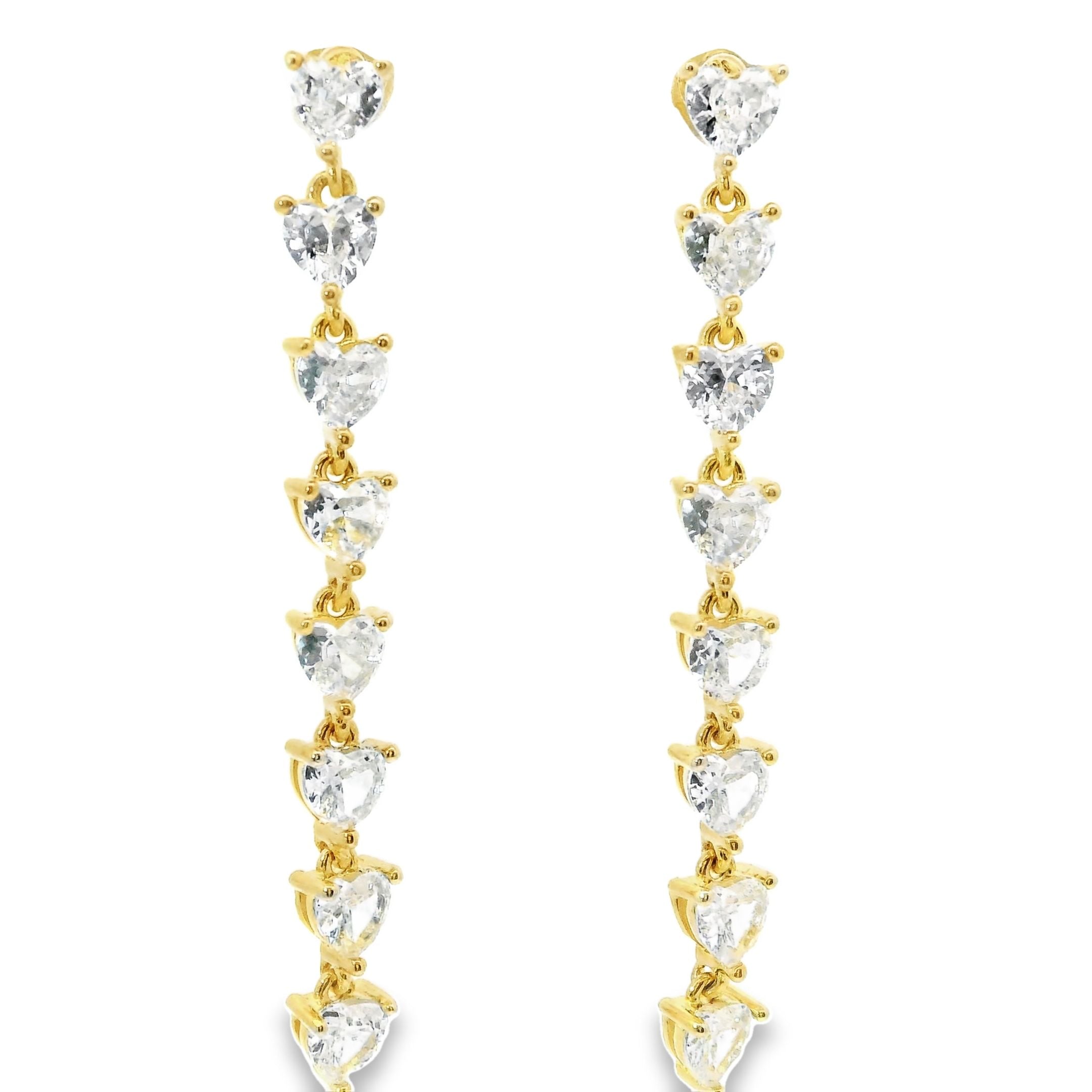 Aretes largos colgantes en plata con baño de oro y corazones en zirconia.